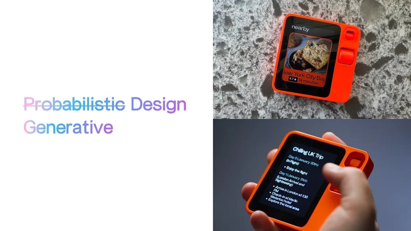 When it comes to probabilistic design, for simplicity here will be called Generative, it's more focused on the context-based creation of a layout exactly to your personal needs and use cases. Let’s not misinterpret it to the one from Rabbit R1 as it wasn’t generated every time on the fly for you, but concept-wise was close enough. In Generative Design, each user interface would slightly differ from one another and would be based on the design system set by designers with rules on how to position elements based on the defined logic. In deterministic design, as we usually create it would otherwise be impossible with the number of users and personality types. However, with the help of LLMs, it all becomes much more possible, using information stored locally on your device to determine what layout for a given situation would work best for you and your mental model of interacting with the device.