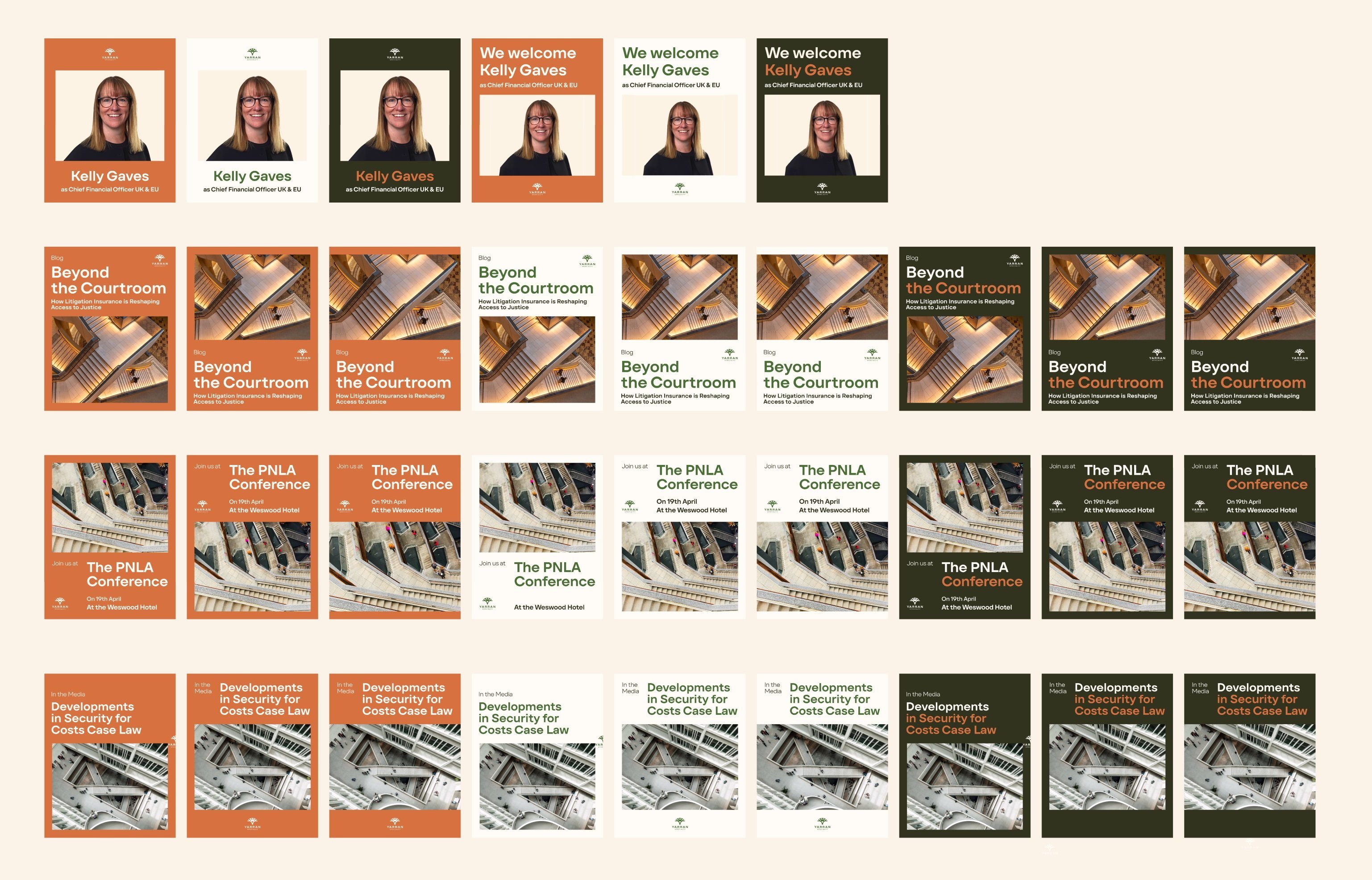 Design system theming, UI layout across pages, component selection, brand translation, copy-to-layout structuring, QA support, and social media post templates.