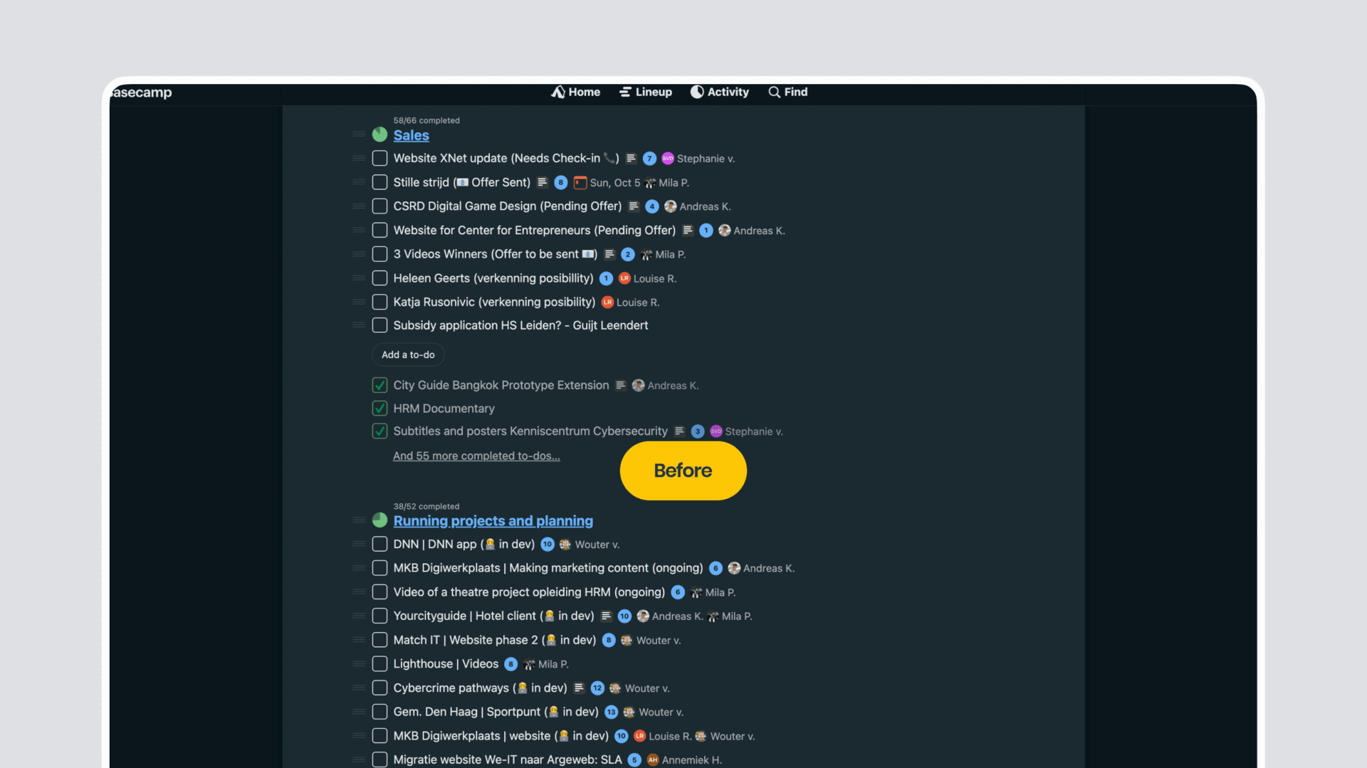 Rebuilt our Basecamp from scratch. Tickets are now centralized with tags like "Lead," "In Dev," and "Needs Feedback". This brought 4x more clarity in project visibility. No more digging.